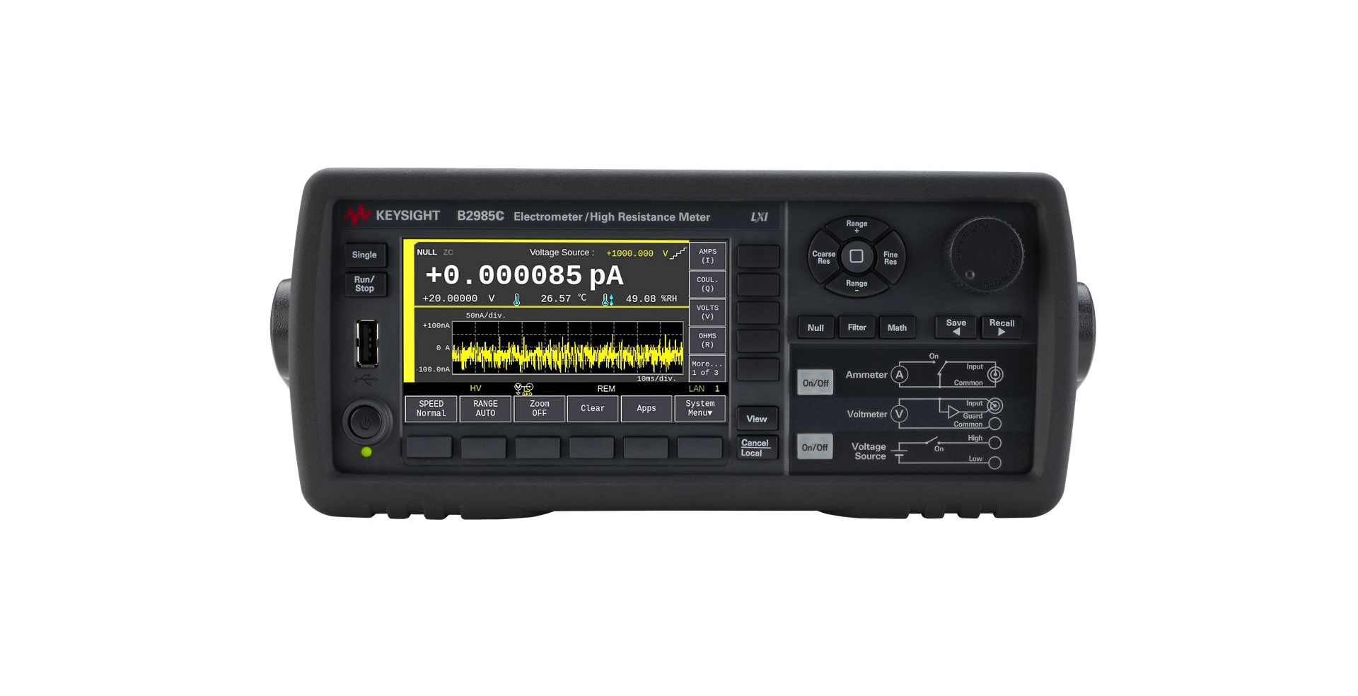 B2985C 전위계/고저항 미터는 0.01fA(0.01 x 10-15A) 분해능과 최대 10PΩ(10 x 1015Ω)에 달하는 큰 저항으로 소전류를 확실히 측정할 수 있는