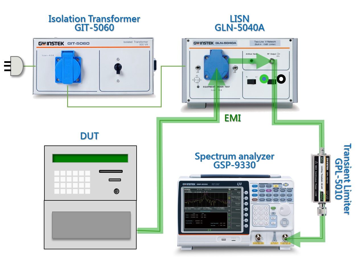 • EMI 전도 테스트 패키지 : 스펙트럼 분석기/ LISN/ 절연 변압기/ 과도 전류 리미터